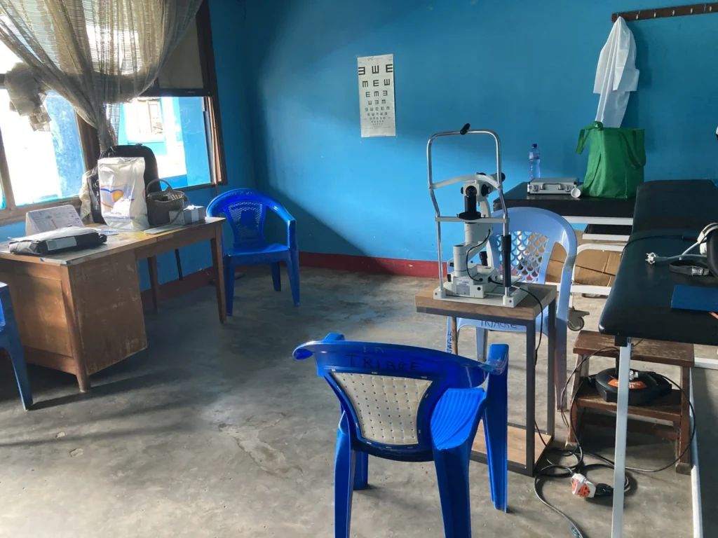 Wir arbeiten im lokalen Krankenhaus, Vor- und Nachuntersuchungen werden in einem kleinen Untersuchungsraum durchgeführt, postoperativ Skiaskopie zur Brillenversorgung durchgeführt.