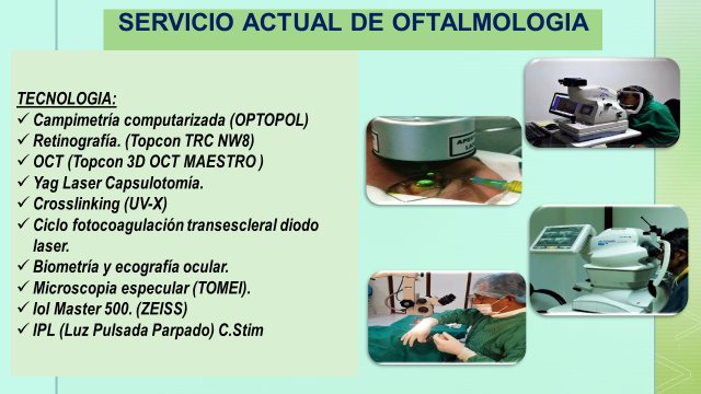 - Für den medizinischen Bereich sind 5 Augenärzte tätig: 1 Retinologe extern (zeitweise bei Bedarf); 1 Facharzt für Glaukom und Strabismus; 2 Allgemein-Augenärzte sowie 1 Fachärztin für Lidchirurgie; im OP Bereich 4 Personen, darunter 2 gut ausgebildete Fachschwestern; zusätzliches Personal zur Absicherung administrativer Aufgaben stehen unter Vertrag: je 1 Wachmann/ Sicherheit (Tag+Nacht), 1 Rezeption/Aufnahme, 1 Kasse, 1 Reinigung; 1 Gesamtverantwortliche für Verwaltung und Finanzen (Frau Nataly Silva)