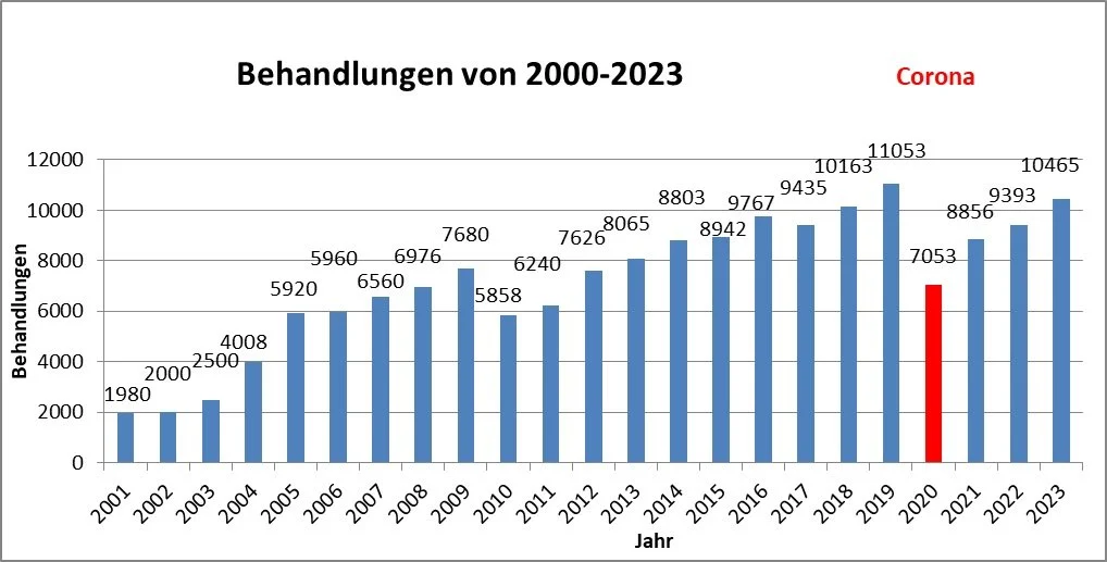 - An 6 Tagen/Woche (Mo.-Sa.) ist die Klinik geöffnet; vorhanden sind 3 Behandlungszimmer/Tag, 2 unabhängige OP-Säle an 5 Tagen/Woche je nach Bedarf; ständiger Zugang zum Bereich Brillenanpassung/Versorgung sowie Apotheke